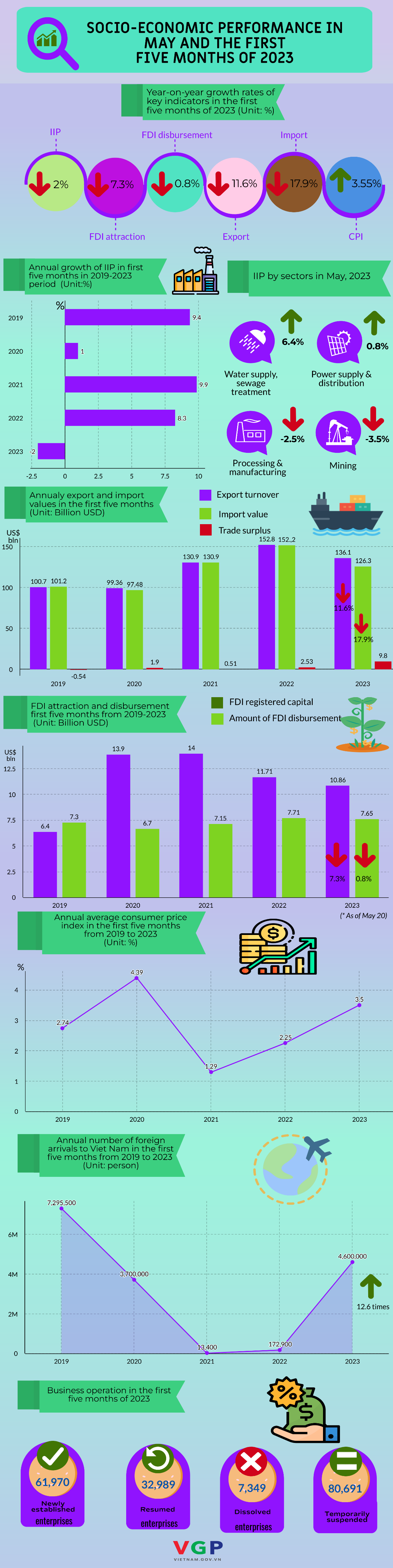VGP - Below are key indicators of the report on socio-economic performance in May 2023 and the first five months recently released by the General Statistics Office (GSO).
