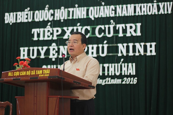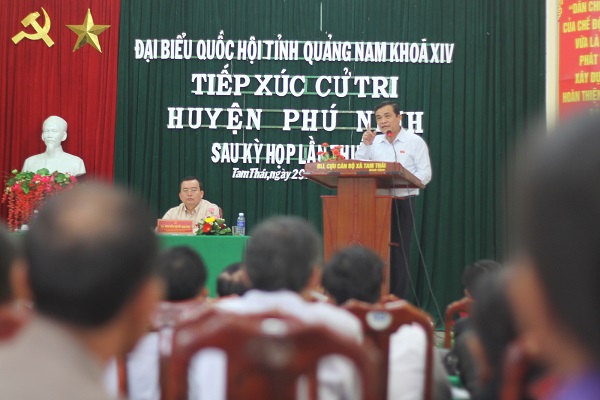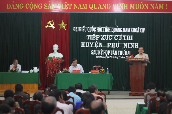 Tại huyện Phú Ninh (tỉnh Quảng Nam), các cử tri đã đặt nhiều câu hỏi liên quan đến việc thi công đường cao tốc Đà Nẵng – Quảng Ngãi đoạn đi qua huyện. Các cử tri cho rằng, việc kiểm kê thiệt hại, thực hiện các chính sách bồi thường, hỗ trợ còn các bất cập, vướng mắc, nên bàn giao mặt bằng cho đơn vị thi công. Tại huyện Tiên Phước, bà con cử tri đề nghị tỉnh và Trung ương hỗ trợ về giáo dục cho con em địa phương cũng như quan tâm đến vấn đề thủy lợi tại huyện này. Ngoài ra, các cử tri tại hai địa phương cũng kiến nghị Trung ương cần có những giải pháp giám sát hiệu quả, quyết liệt hơn nữa trong công tác phòng chống tham nhũng; tiếp tục tháo gỡ các vướng mắc, bất cập trong việc thực hiện chế độ chính sách cho người có công; nâng mức trợ cấp cho đội ngũ cán bộ thôn, cán bộ không chuyên trách...