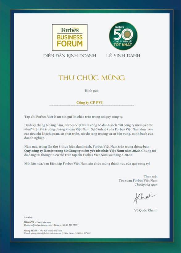 Năm nay, trong lần thứ bảy thực hiện danh sách, Công ty Cổ phần PVI (PVI) vinh đự được Forbes Việt Nam bình chọn là một trong 50 Công ty niêm yết tốt nhất Việt Nam năm 2020.
