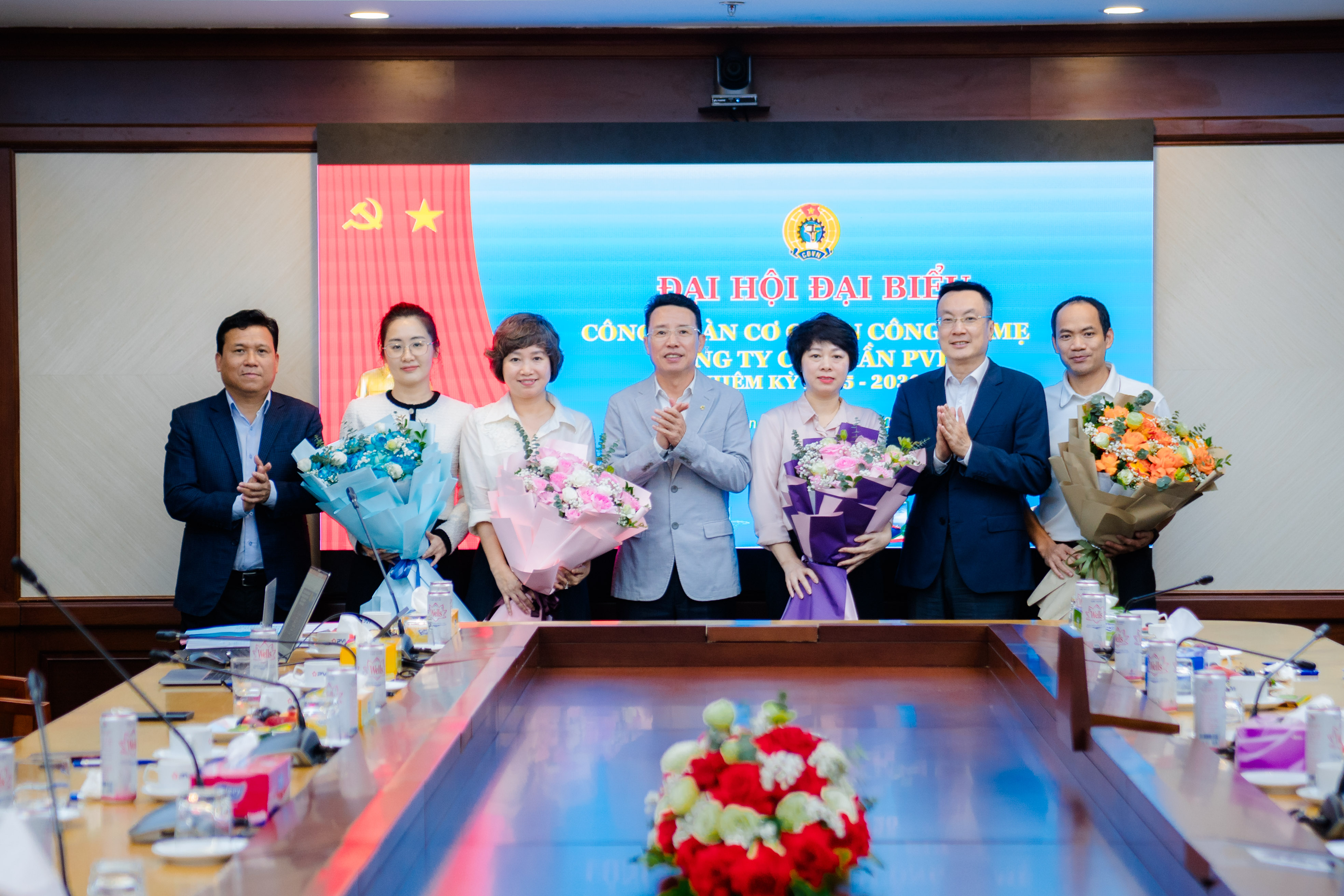 Đồng chí Nguyễn Tuấn Tú – Bí thư đảng ủy, Tổng Giám Đốc PVI và đồng chí Đặng Tiến Dũng – Chủ tịch Công đoàn PVI tặng hoa các đồng chí Ban chấp hành Công đoàn khóa mới