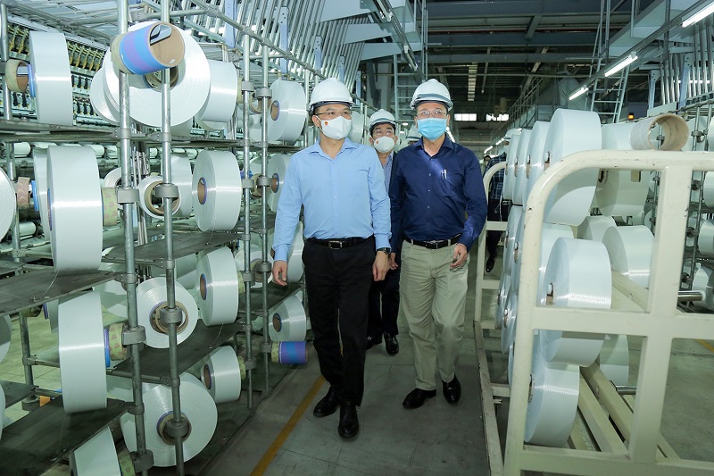 Năm 2021, VNPOLY đã được đưa ra khỏi dự án yếu kém ngành Công Thương. Trong ảnh, Tổng Giám đốc Petrovietnam Lê Mạnh Hùng kiểm tra Nhà máy Xơ sợi Đình Vũ