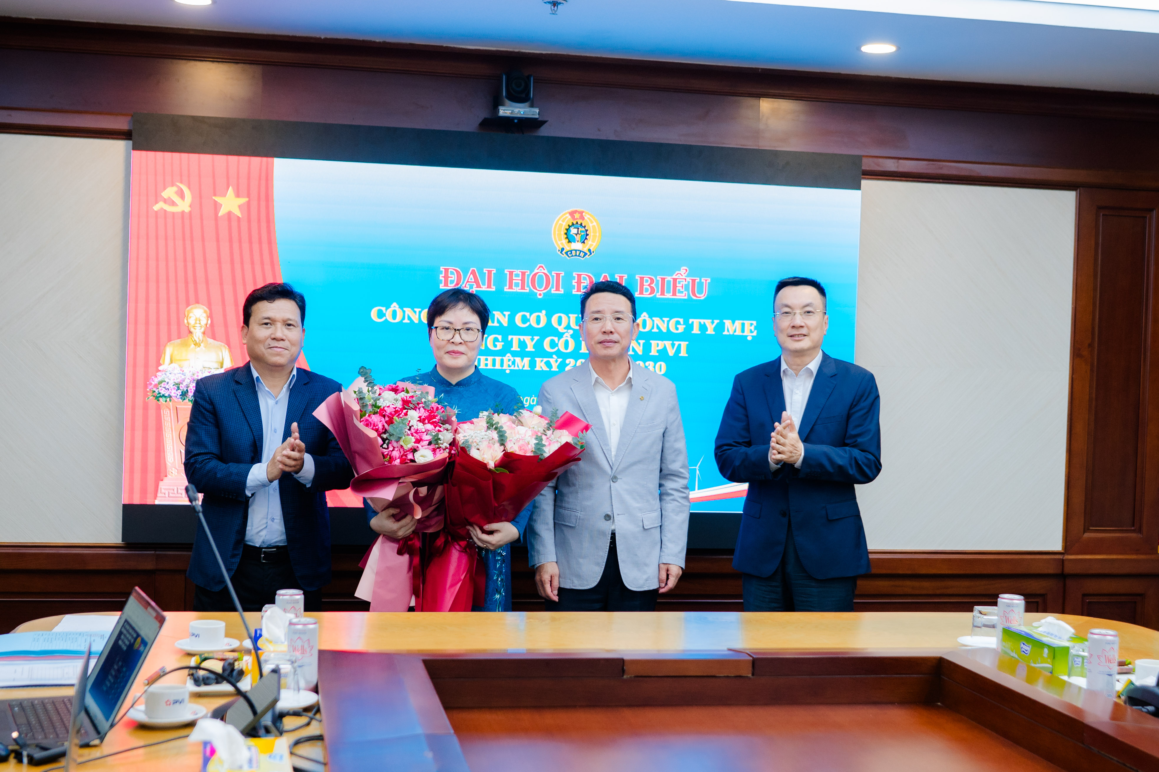 Đồng chí Nguyễn Tuấn Tú – Bí thư đảng ủy, Tổng Giám Đốc PVI và đồng chí Đặng Tiến Dũng – Chủ tịch Công đoàn PVI tặng hoa các đồng chí Ban chấp hành Công đoàn khóa mới